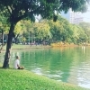 バンコク、早朝のルンピニー公園で 瞑想するタイ人